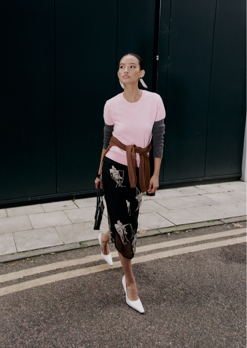 The appeal of a neutral knit is that it should fit effortlessly into your existing wardrobe, be that twinned with denim, cargo pants or a dress. But it shouldn’t be so adaptable that it becomes invisible. Play with tonal layering or choosing a shade that matches the bottom half – such as The Garment’s versatile Grey Como Mini V Sweater with a pair of tailored grey trousers or a grey pencil skirt, or Dunst’s Beige Cashmere Crewneck Sweater with a suede skirt and jacket for the full colour drenching effect. Need inspiration? Look to Aussie girl Margot Robbie who regularly matches her knit wear with the rest of her look for a considered yet casual outfit.