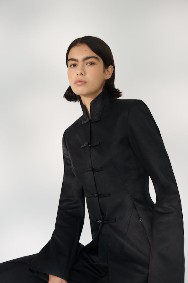 The pair bring their individual strengths to the brand, Yang focus’ on draping and creative pattern cutting whilst Litzén has sharp, menswear inspired tailoring skills to bring to the table. The result? Impeccably executed design. Samuel Guì Yang celebrates Chinese femininity with flattering silhouettes of traditional heritage such as Mandarin collars, wrap features and kimono sleeves. These are combined with elements of Western dressmaking, for example, sharp cuts and the fitted form, marrying the two cultures in unison. Many of their designs begin with the Cheongsam dress, which was made popular in China in the 1920’s, as a starting point for their creations. This in turn is developed in a meticulously technical way, where proportions, silhouettes and details are transformed to create a wearable version of relaxed luxury which plays homage to its cultural roots.