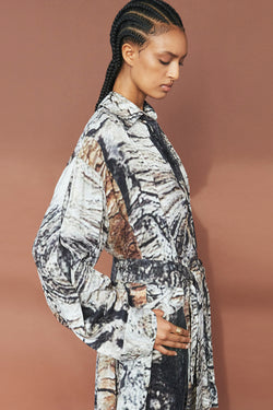 This company ethos translates organically into the collection, the colours – a rich mix of khaki, inky black, berry red and bark print feel absolutely natural and Mother Earth-inspired.
