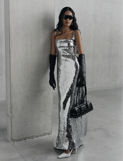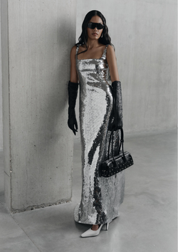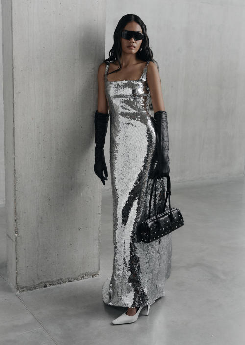 Leaning into the era’s powerful influence from music, fashion and film, 16Arlington AW25 is bold, captivating and absolutely not made for staying in. Their Electra Silver Gown – a full length sequin encrusted dress that will turn heads and stop traffic is the party dress of the season. For an edgy take, pair the dress with long leather gloves, and bold calf skin boots from Jude.