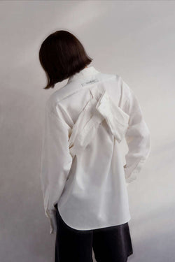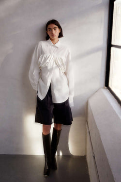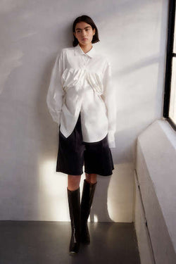 Kimhēkim favours exaggerated silhouettes and elegant aesthetics; expect clean-cut shapes with extravagant details. The label’s read-to-wear features a dramatic take on everyday apparel such as the Reconstructed classic white shirt with exaggerated cuffs; a refreshing take on the wardrobe classic. Denim features heavily in the collection, from the constructed Corset Top to the Denim Cargo Pants; sure to be an instant sell-out.