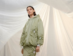 With that landmark puffer, I used to explain it to myself by imagining my wandering Korean ancestors carrying multiple bindles with cherished possessions on their body, and in the jacket itself, the inserts of vintage fabric symbolised those. This knot motif becomes reworked for different fabrics, for example becoming more delicate petal-shaped cut-outs on thin jersey.